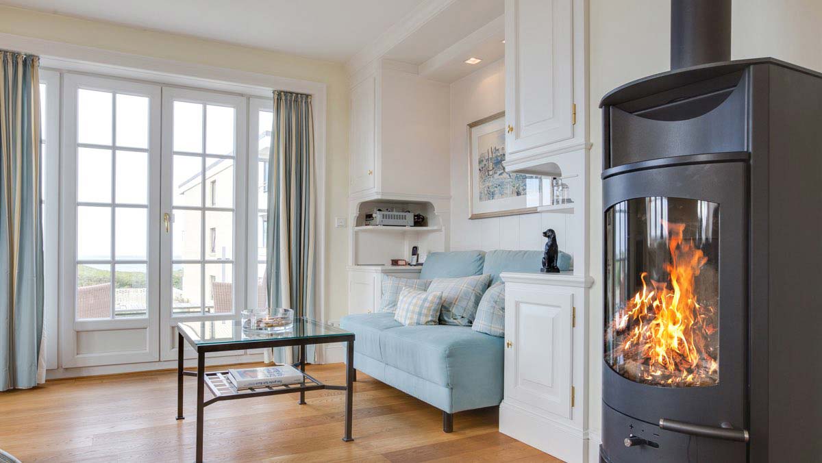 Lichtdurchfluteter, hochwertig möblierter Wohnraum mit Meerblick, Flatscreen-TV, Mini Hifi-Anlage, Telefon und WLAN. Kaminofen. Integrierte Luxus-Küche mit Geschirrspüler sowie Microwellen- Backofenkombination. Wohlfühlbad mit Dusche und WC. Waschmaschine/Trockner. Ein hübsch dekorierter Raum mit Einzelbett (ca. 1x2,1 m). Kleiner Westbalkon.